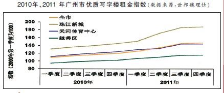 預(yù)警二:新興商圈帶動(dòng)租金下降世邦魏理仕數(shù)據(jù)顯示,2011 年廣州市優(yōu)質(zhì)商鋪?zhàn)饨鸹境史€(wěn)中微降的趨勢(shì),其主要原因是珠江新城和白云新城等新興商圈年內(nèi)有大體量新項(xiàng)目入市。新興商圈項(xiàng)目主要以低租金吸引客戶,拉低了全市平均租金。因此至四季度末,全市整體租金水平均為每天每平方米46.5 元,同比下跌3.1%。相比之下, 同期傳統(tǒng)商圈的租金仍然維持堅(jiān)挺并略有上升,2011 年末天河體育中心商圈租金同比上升6.7%,而北京路和陵園西商圈租金則錄得11.1%的年度漲幅。由此可見, 買鋪收租應(yīng)始終考慮地段的重要因素,不可輕率入市。預(yù)警三:寫字樓空置率將有所上升2011年一手寫字樓成交量持續(xù)增長,天河區(qū)的珠江新城依然是成交量最大的區(qū)域,而外圍區(qū)域蘿崗區(qū)、番禺區(qū)和南沙區(qū)等皆有活躍的表現(xiàn),主要原因是政策扶持、交通通達(dá)度的提高與較低的成交總價(jià)。成交價(jià)格方面,2011 年攀升較大,12 月均價(jià)達(dá)元/平方米,創(chuàng)近兩年新高。據(jù)中原地產(chǎn)數(shù)據(jù)顯示,2011 年廣州市寫字樓租金升幅大約在5%左右, 但年預(yù)計(jì)會(huì)有新增項(xiàng)目持續(xù)入市(特別是珠江新城),所以租金受龐大的新增量壓力影響,難以大幅上升。空置率方面,2011 年廣州市寫字樓空置率有所攀升。即使吸納量在亞運(yùn)后得到攀升,但廣州市有高達(dá)50 多萬平方米的甲級(jí)寫字樓新增面積供應(yīng),空置率全年達(dá),比2010 年增加超過三成。《藍(lán)皮書》預(yù)計(jì),鑒于2012 年新增供應(yīng)檔次偏高, 市場(chǎng)吸納度還不足以應(yīng)對(duì)眾多新增寫字樓,空置率依然會(huì)有上升的趨勢(shì)。預(yù)警四:優(yōu)質(zhì)辦公物業(yè)租金或下調(diào)據(jù)世邦魏理仕數(shù)據(jù)顯示,2011 年廣州市優(yōu)質(zhì)寫字樓租賃成交活躍,供需兩旺,且受通脹大環(huán)境影響,平均租金在全年內(nèi)持續(xù)攀升。本年度前三季度租金上漲迅速,其中第二和第三季度更分別錄得環(huán)比7.4%和的增幅,達(dá)近五年來的高位,至四季度由于需求增速下降而租金升幅有所放緩。截至2011 年第四季度,廣州優(yōu)質(zhì)寫字樓的平均租金升至每月每平方米132 元,同比升幅高達(dá)22.5%,已超過金融危機(jī)前的平均租金水平。其中珠江新城四季度優(yōu)質(zhì)寫字樓的租金達(dá)到每月每平方米164 元,同比升30.0%。另外,在2011 年度的新增供應(yīng)中, 甲級(jí)寫字樓供應(yīng)量高達(dá)。甲級(jí)與非甲級(jí)寫字樓的租金差距被逐漸拉大,這一現(xiàn)象反映了當(dāng)前廣州寫字樓的需求面有品質(zhì)化、高端化的趨勢(shì)。不過, 隨著廣州甲級(jí)寫字樓與乙級(jí)寫字樓租金差距逐步擴(kuò)大,乙級(jí)寫字樓的租金優(yōu)勢(shì)將愈加凸顯, 甲級(jí)寫字樓的租賃成交可能將出現(xiàn)放緩跡象。從中期來看, 當(dāng)大量優(yōu)質(zhì)寫字樓物業(yè)的逐步投入使用, 對(duì)租金的壓力也將逐步體現(xiàn), 優(yōu)質(zhì)辦公物業(yè)租金將可能會(huì)出現(xiàn)下調(diào)。商業(yè)物業(yè)方面,大量的新增供應(yīng)預(yù)料將令優(yōu)質(zhì)商業(yè)物業(yè)租金持續(xù)向下調(diào)整,但由于當(dāng)前的國際服飾品牌以及國內(nèi)大型餐飲租戶的積極擴(kuò)張,相信整體的空置率水平不會(huì)出現(xiàn)大幅增長。