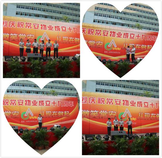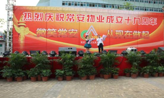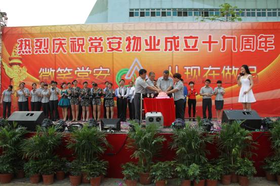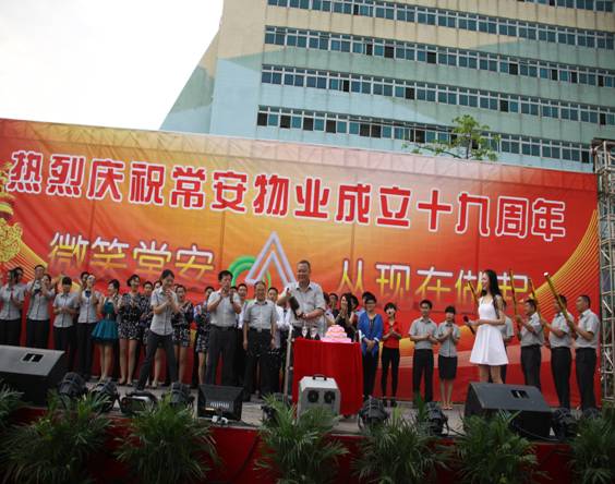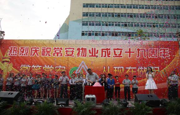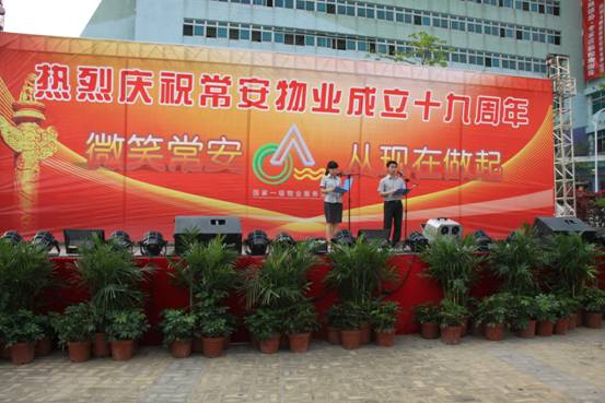 常安物業十九周年慶典于2014年4月19日下午在百旺信園區廣場成功舉辦,來自各服務中心的一百多位同事齊聚現場,共同慶祝常安十九周歲生日!現場活動十分精彩,有充滿活力的舞蹈、情感真摯的詩歌朗誦,還有優美動聽的情歌對唱,此外還加入了以“微笑常安”為主題的征文朗誦和頒獎典禮。回顧常安十九年來的奮斗史,我們常安人榮辱與共,迎來輝煌的今天;今天我們攜手共進,展望未來,明日再攀成功的高峰。讓我們共同舉杯,祝愿我們常安的明天會更好。