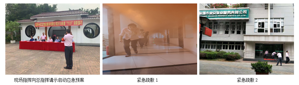 緊急預(yù)案啟動后,總指揮常安物業(yè)董事長張武和現(xiàn)場指揮常安物業(yè)安全主管曾德良在現(xiàn)場組織疏散、警戒、滅火、報警、救護(hù)、后勤、設(shè)備保障、消防車指引等9個應(yīng)急小組全面參與到火災(zāi)撲滅的現(xiàn)場救援工作之中,應(yīng)急工作分工明確,滅火演練有條不紊的進(jìn)行。