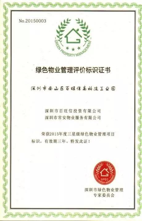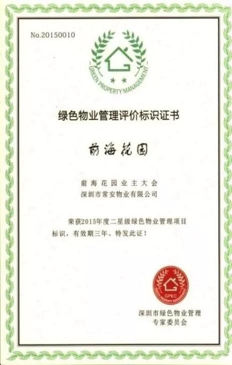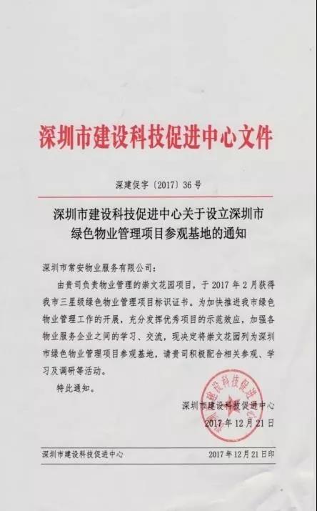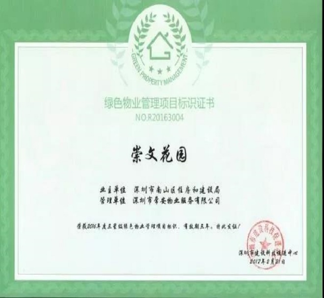 依據(jù)2011 年深圳出臺(tái)的首部《深圳市綠色物業(yè)管理導(dǎo)則(試行)》和 2013 年出臺(tái)的《深圳市綠色物業(yè)管理項(xiàng)目評(píng)價(jià)辦法和細(xì)則(試行)》,常安物業(yè)積極響應(yīng)并開(kāi)展綠色物業(yè)管理工作,2016 年至今,共有四個(gè)項(xiàng)目榮獲了深圳市政府部門(mén)頒發(fā)的綠色物業(yè)管理項(xiàng)目證書(shū),其中崇文花園還被深圳市政府部門(mén)列為深圳市綠色物業(yè)管理項(xiàng)目參觀基地,2019年出任廣東省綠色供應(yīng)鏈協(xié)會(huì)綠色物業(yè)管理專業(yè)委員會(huì)副主任委員單位。色物業(yè)管理