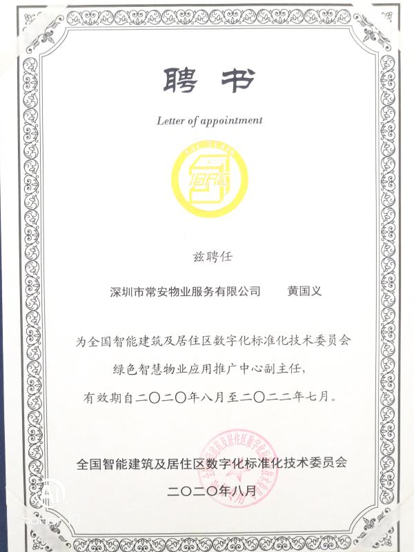 會上,常安物業公司副總經理黃國義獲聘為全國智能建筑及居住區數字化標準化技術委員會綠色智慧物業應用推廣中心副主任。