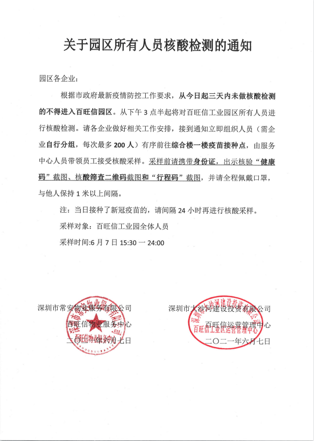 為響應我市關于疫情防控的最新要求,深圳市常安物業服務有限公司及下屬各服務中心全力配合南山區防疫部門、各轄區社區工作站全面覆蓋我司在管項目的核酸檢測工作。